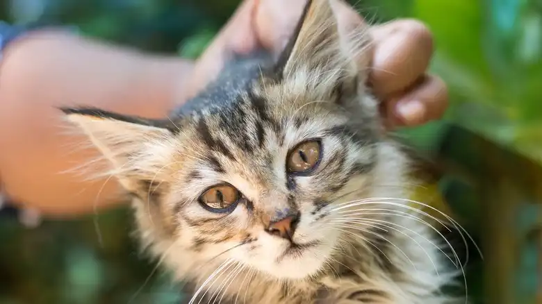 To start, gently place your cat in your lap or on a table where you can easily reach the loose skin behind their neck. Using your fingers, gently pinch the skin between your cat's shoulder blades and pull it upward, making a "tent" shape. In healthy, hydrated cats, the skin will quickly snap back into its normal position. If the skin seems sticky, or is slow to return to normal, this can indicate dehydration. Typically, the slower the return to normal the greater the dehydration. However, older cats and certain skin-related diseases can affect this.